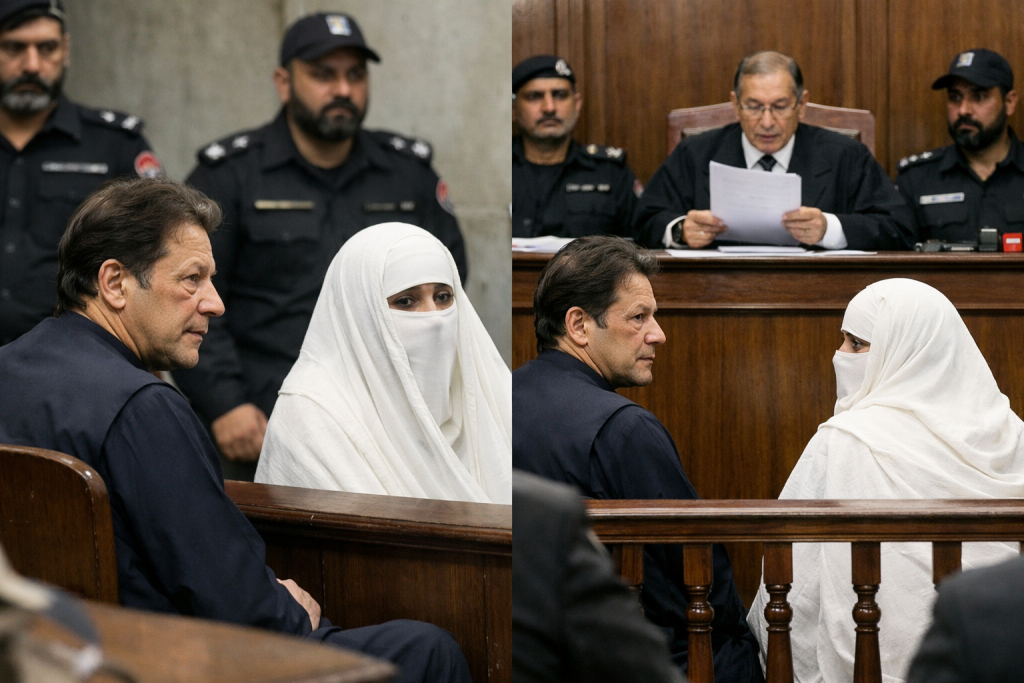 اڈیالہ جیل کے عدالتی اہلکار کے مطابق فیصلہ سنائے جانے کے وقت عمران خان اور بشریٰ بی بی کو کمرۂ عدالت میں پیش کیا گیا اور فیصلہ ان کی موجودگی میں سنایا گیا۔ تاہم عمران خان کی قانونی ٹیم کا مؤقف ہے کہ فیصلہ وکلا اور ملزمان کی غیرموجودگی میں سنایا گیا۔